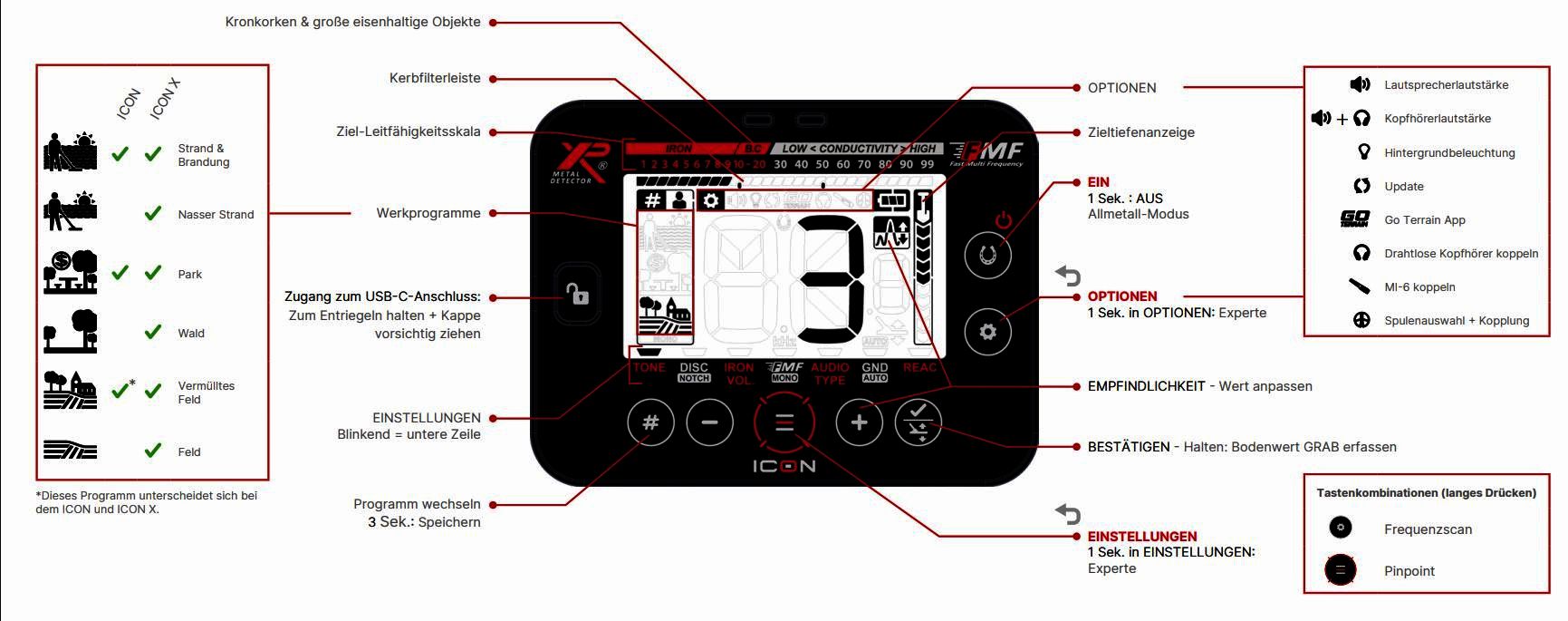 Der ICON verbindet offenbar typische XP-Stärken wie geringes Gewicht, schnelle Signalverarbeitung, kabellose Technik und gutes Audio mit einer modernen FMF-Plattform. Dazu kommt die einfache Bedienung. XP scheint den ICON nicht als komplizierten Experten-Detektor zu positionieren, sondern als Gerät, das auch ohne langes Menütauchen zuverlässig funktionieren soll. Einschalten, Programm wählen, suchen — das ist für viele Anwender attraktiver als ein Detektor, der zwar alles kann, bei dem man aber vorher halbwegs das Gefühl haben muss, eine kleine Raumfähre zu starten.
