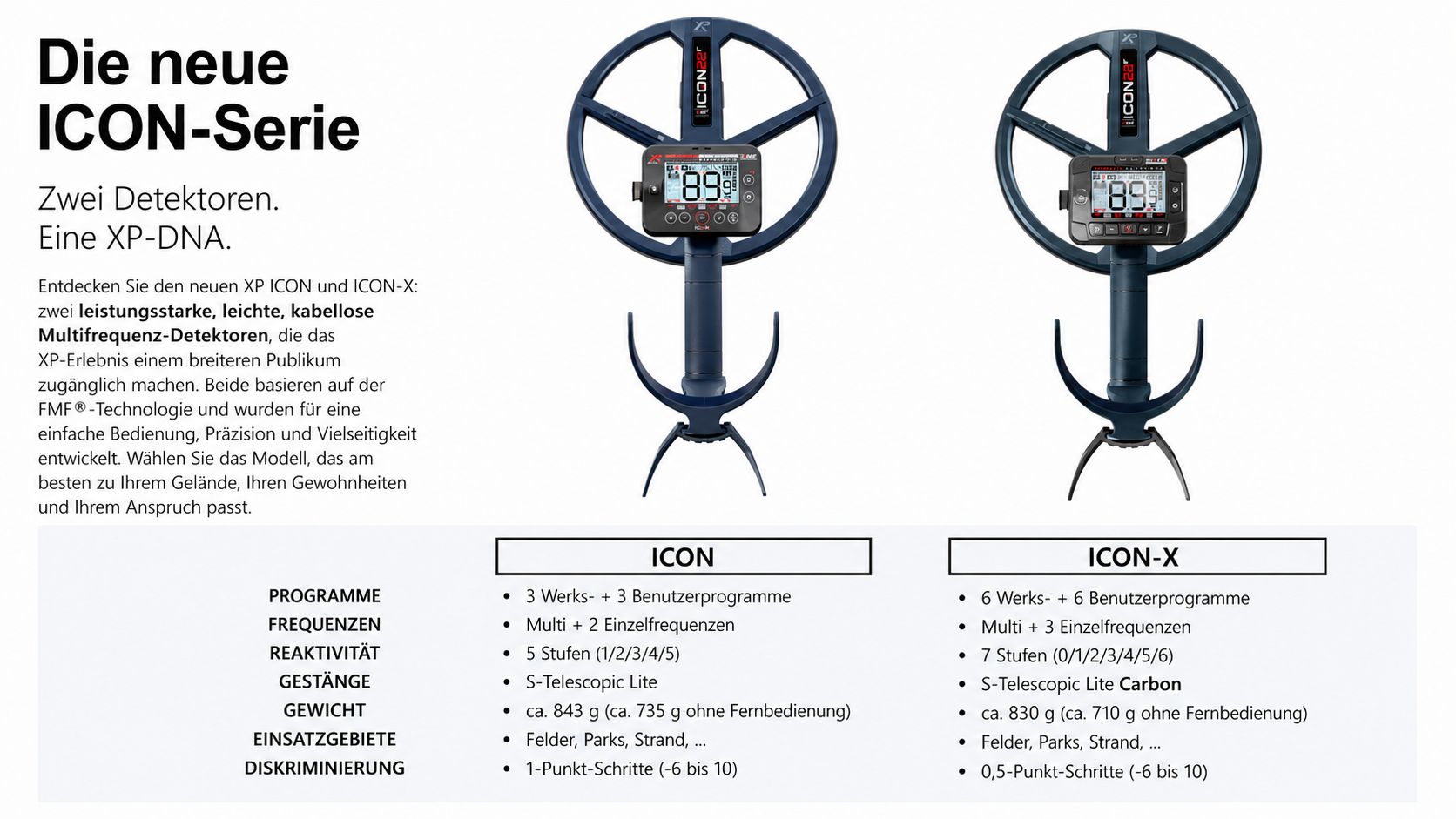 Der XP ICON beziehungsweise XP ICON-X wird als besonders leichter, kabelloser und einfach zu bedienender Metalldetektor vorgestellt. Die ICON-Serie arbeitet nach den bisher vorliegenden Daten mit FMF-Technologie, also simultaner Multifrequenztechnik. Das bedeutet: Der Detektor nutzt nicht nur eine einzelne Arbeitsfrequenz, sondern kann mehrere Frequenzen gleichzeitig verarbeiten. Gerade bei wechselnden Böden, unterschiedlichen Zielgrößen und schwierigen Bedingungen kann das ein echter Vorteil sein. XP kombiniert diese Technik beim ICON mit einem sehr leichten Aufbau, kabelloser Signalübertragung, verschiedenen Audiooptionen, einstellbarer Reaktivität, Eisenlautstärke, Notch-Funktionen und einer wasserdichten Bauweise bis 5 Meter. Damit wirkt der ICON nicht wie ein einfacher Billigdetektor, sondern eher wie eine bewusst abgespeckte, moderne XP-Plattform für eine deutlich größere Zielgruppe.